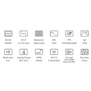 Dual-band Wi-Fi: The external dual-band antenna, which supports both 2.4 GHz and 5 GHz frequencies, enables stable and smooth use of the camera within 20 metres. With the ASIAir app from ZWO, you can control the camera and view the images easily via your Smartphone.