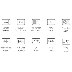 This camera is equipped with a modern 1.6" sensor with 3552*3552 Pixels. In addition to modern Starvis 2 technology (with back illumination), the IMX676 offers an extremely smooth image without amplifier glow – but its most impressive features are its very high resolution of 2.0 µm Pixels and its relatively high frame rate. This makes the camera particularly suitable for the following applications: