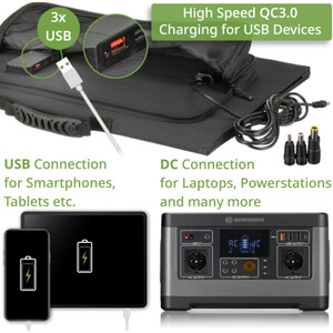 All instruments with a USB power supply connection or the above-mentioned DC barrel connector can be quickly recharged with the solar charger – e.g. smartphones, tablets, power banks, portable PlayStations, MP4 players, GPS devices and Bluetooth headphones. For charging large power stations, we recommend the more powerful BRESSER solar panels with at least 60 watts of output power – see item numbers 3810050, 3810060, 3810070.