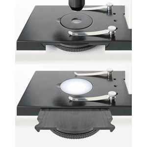 The Duolux is a complete new Bresser development. It combines the advantages of an incident light type with a transmission-type microscope to a handy combined microscope. With an integrated slide table, the classical microscope stage can be quickly transformed into an incident light stage with a 38 mm diameter work field. The 45 mm variable distance between objective and work field is large enough to be able to view most interesting objects with incident light. The illumination source can easily be adjusted with a little joystick, also a new development by Bresser. Both illuminators can be switched on and off and are separately dimmable and can be used with battery or AC adaptor. For transmission-type microscopy, the integrated filter wheel is an optimal addition. The complete standard accessories (e.g. electronic eyepiece, slides, preparation aids) can be stored in the integrated drawer.
