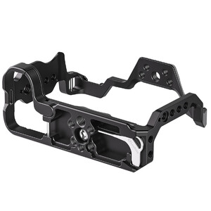 The camera cage allows accessories such as a microphone, monitor or handle to be attached to the camera. The cage is designed so that all camera connections remain free, meaning that the camera's functionality is not restricted. In addition to the photo screw for mounting the camera, the cage offers additional fixing points so that the camera does not twist in the cage.