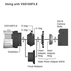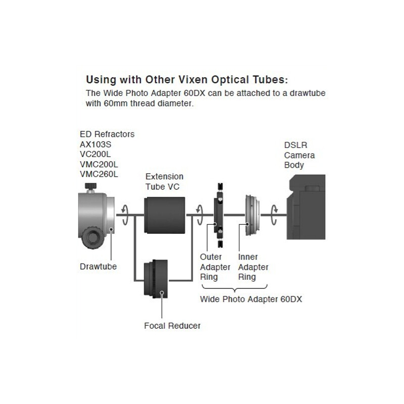 El adaptador fotográfico ancho 60DX conecta su cámara DSLR a un telescopio con rosca M60. Gracias a un diseño mejorado y el uso de nuevos materiales, Vixen ha podido mejorar significativamente la precisión y la capacidad de carga con respecto a los adaptadores convencionales. El gran diámetro interior del adaptador evita el sombreado en los bordes con las cámaras DSLR de fotograma completo.