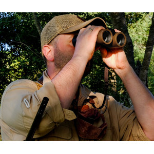 El color natural y terroso, el diseño extremadamente ligero y equilibrado con agarre ergonómico, así como la exclusiva protección silenciosa de los prismáticos fabricada en loden de alta calidad, son ideales para un manejo discreto y la observación en el coto.