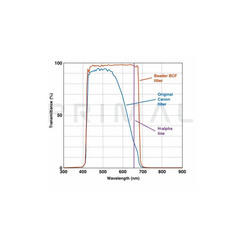 La conversión (astromodificación) la realiza la empresa PrimaLuceLab en italia sustituyendo el filtro original de Canon por el filtro BCF de Baader Planetario, desarrollado especialmente para este fin en alemania. Puede ver la diferencia en la ilustración "Curva de transmisión".