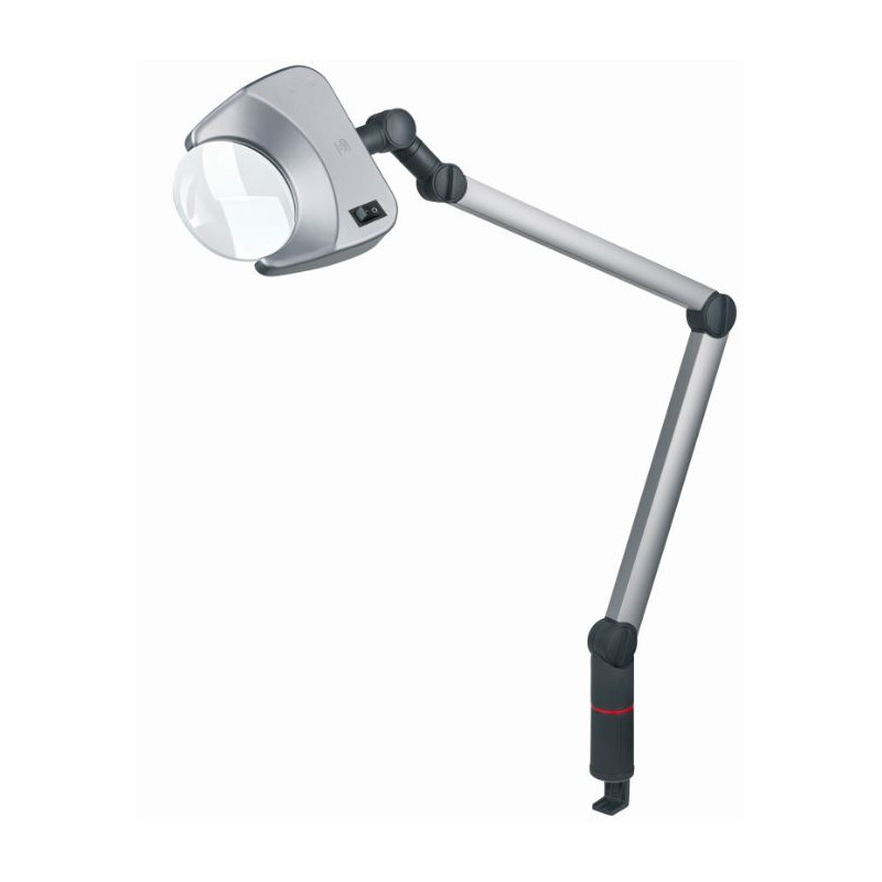 - Brazo de aluminio lacado de 2 piezas con articulaciones de plástico ajustables y mecanismo de compensación por resorte (radio de acción de aprox. 1 m) o brazo flexible en forma de cuello de cisne, también disponible con un diámetro de lente de 120 mm.