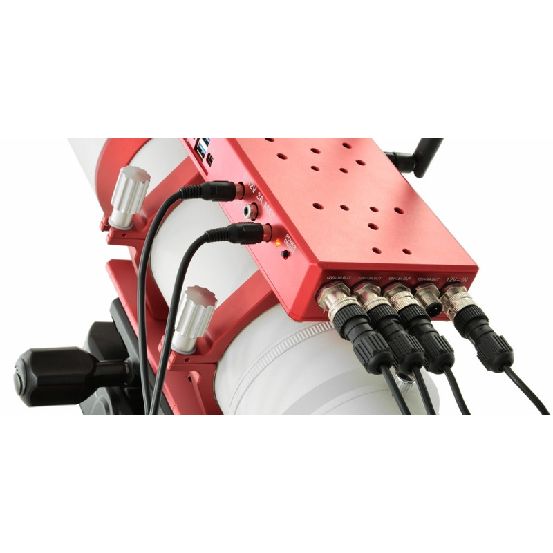 El sistema dispone de una entrada de 12 V y siete salidas de 12 V. De este modo, puede alimentar todos sus dispositivos a la vez con una batería compacta o una sola fuente de alimentación. La montura, los sistemas de refrigeración de la cámara y las cintas calefactadas se conectan directamente al EAGLE. Un sofisticado sistema de gestión le ofrece un control total. Por ejemplo, puede regular la tensión de tres de las salidas entre 0 V y 12 V (ideal para cintas de calor para los protectores dew shield). Todas estas opciones de conexión le permiten instalar todo el equipo una sola vez y conectarlo con una gestión óptima de los cables. El único cable del que tendrá que preocuparse es el cable de alimentación del EAGLE.