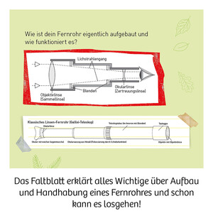 The lens telescope with 12x magnification and extendable metal tube is easy to adjust and precise. The instructions explain to children how a lens telescope is constructed and give tips on how best to use it for their observations.