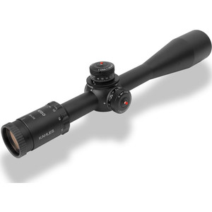 This riflescope uses the Double Dot reticle. It is intended more for use by sport shooters. The reticle is located in the second image plane. When the magnification is changed, the reticle remains the same size – the size of the image changes, but not that of the reticle. Even at high magnifications, only a small part of the target is obscured.