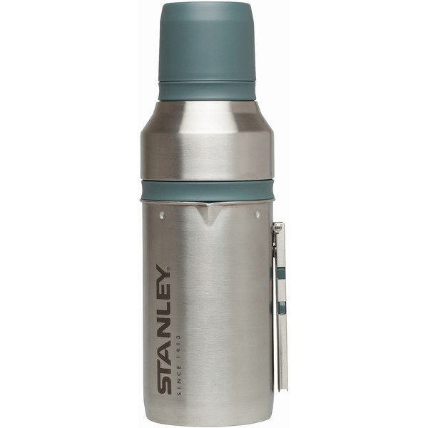 The Mountain Vacuum Coffee System from US brand Stanley is a practical companion for on the go. The Stanley Press Filter System not only allows you to prepare coffee, but also keeps it hot for up to 24 hours thanks to the double-walled vacuum bottle. A stainless steel container with a folding handle serves as a cooking pot. The lid offers storage space for sufficient coffee powder. Two drinking cups are located above the bottle cap.