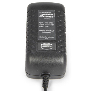 Il nuovo alimentatore Outdoor-Telescope-Power trasforma la comune corrente AC da 90 a 260 V in corrente DC da 12.8 Volt/1.5 A e la tensione, anche in caso di temperature estremamente basse, non si abbassa mai al punto da creare problemi ai componenti elettrici od ai motori della montatura. Con un rendimento continuo di 1.5 A/19 Watt , viene garantita una sufficiente riserva anche a pieno carico, anche con massicce strumentazioni sulla montatura e notevoli cambi di carico. Oltre alla maggiore tensione di base, il raggio di operatività da -25° a +40° è ideale per l'utilizzo all'esterno. Grazie al cavo prolungato da 2.5 m tra alimentatore e presa ad angolo, lo strumento non crea inciampi e rimane completamente a terra. La spina ad angolo protegge l'elettronica del telescopio da danni alla presa ed il trasformatore da danni al cavo o altri pericoli. Se si inciampa accidentalmente nel cavo, la presa non si stacca dal telescopio con uno strattone laterale, ma si libera correttamente dal giunto della spina ad angolo.
