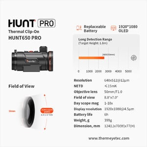 Il Hunt 650 Pro di ThermTec stabilisce nuovi standard nella tecnologia di imaging termico. Questo versatile dispositivo aggiuntivo, il Hunt 650 Pro, può essere montato rapidamente e facilmente sul vostro mirino diurno (adapter disponibile come optional) e trasforma il vostro mirino in un potente visore notturno. Perfetto per esperienze di caccia impegnative, il Hunt 650 Pro convince per l'ottimo rapporto qualità-prezzo, un sensore ad alta risoluzione da 640x512 Pixel, una lente da 50 mm con messa a fuoco manuale e innovativa rotella di messa a fuoco, una sensibilità ≤ 15 mK, un'impressionante distanza di rilevamento fino a 2.600 metri, un campo visivo medio di circa 15,4 metri a 100 metri e un sistema di batterie sostituibili con fino a 12 ore di autonomia grazie alla seconda batteria in dotazione, che può essere comodamente ricaricata tramite USB-C.