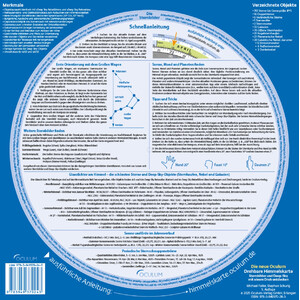 Il retro spiega l'uso e fornisce ulteriori suggerimenti per l'osservazione, nonché dati su oggetti celesti selezionati e un'anteprima di importanti eventi astronomici. Inoltre, sul retro troverete un link alla homepage dell'editore. Qui, sotto il prodotto "Carta celeste girevole ", potrete vedere l'attuale posizione del Sole, della Luna e dei pianeti, nonché l'attuale cielo stellato. Con questa aggiunta, la carta celeste è senza tempo!