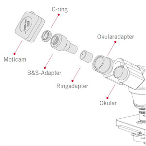 È sufficiente collegare l'adattatore per il tubo oculare alla Moticam. Rimuovete un oculare dal microscopio e sostituitelo con la combinazione Moticam-Adattatore. Avtrete così trasformato il vostro microscopio convenzionale in un microscopio digitale. Lo speciale adattatore per il tubo oculare (B&S) è acquistabile a parte. Questa soluzione è applicabile anche a microscopi di altre marche