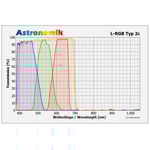 The transmission properties of the L-RGB Typ 2c filters are optimized for CCD astrophotography. The set allows to take images in correct colour for all types of objects. Where other brands make strange compromises, Astronomik is doing the best colour reproduction possible. Both stars as well as objects that emit only in spectral lines, are reproduced in their true colors. You get CCD images with perfect colors, as if the objects where bright enough to be seen with photopic vision. This feature is the main difference between Astronomik filters an those of other manufacturers.