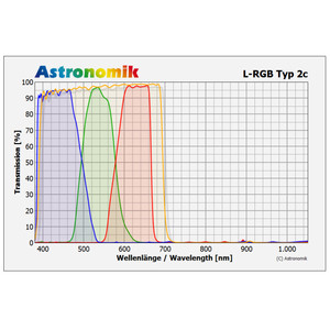 The transmission properties of the L-RGB Typ 2c filters are optimized for CCD astrophotography. The set allows to take images in correct colour for all types of objects. Where other brands make strange compromises, Astronomik is doing the best colour reproduction possible. Both stars as well as objects that emit only in spectral lines, are reproduced in their true colors. You get CCD images with perfect colors, as if the objects where bright enough to be seen with photopic vision. This feature is the main difference between Astronomik filters an those of other manufacturers.