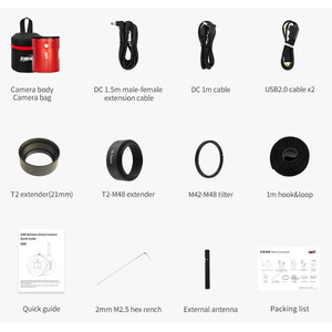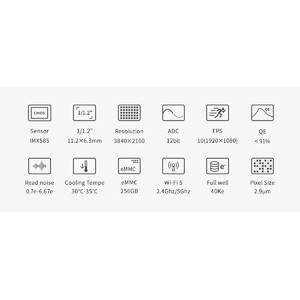 Dualband wifi: de externe dualband-antenne, die zowel 2,4 GHz- als 5 GHz-frequenties ondersteunt, zorgt voor een stabiel en soepel gebruik van de camera binnen een straal van 20 meter. Met de ASIAir-app van ZWO bedient u de camera en bekijkt u de beelden eenvoudig via uw Smartphone.