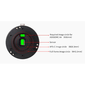 Vereisten voor de telescoop: ZWO Air-camera's zijn compatibel met telescopen die APS-C of grotere beeldformaten ondersteunen. Bij gebruik van een telescoop met APS-C-beeldcirkel kan er een lichte vervorming van de geleidingsster optreden. Voor een nauwkeurigere en stabielere tracking (autoguiding) raden wij het gebruik van een telescoop met volformaat of een grotere beeldcirkel aan.