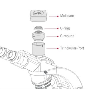 Bevestig de Moticam aan de C-mount adapter en bevestig deze vervolgens aan de trinoculaire poort. Deze combinatie biedt u de vrijheid om met beide ogen te blijven observeren terwijl de Moticam is aangesloten. De C-mount adapter moet worden gekozen op basis van de chipgrootte van de camera. Om er zeker van te zijn dat u de juiste adapter kiest, kunt u contact opnemen met een van onze specialisten.