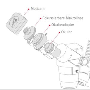 Sluit de focusseerbare macrolens eenvoudig aan op de camera en kies de juiste oculair adapter voor uw microscoop. Plaats vervolgens de complete combinatie op het oculair en uw conventionele microscoop is omgetoverd tot een digitale microscoop. Deze oplossing kan ook worden toegepast op niet-Motic-microscopen.