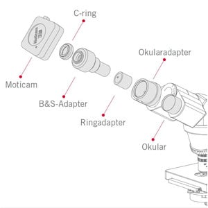 Schroef de oculair adapter eenvoudig op de Moticam. Verwijder een oculair van de microscoop en vervang deze door de Moticam-oculair adaptercombinatie. Uw conventionele microscoop is nu omgebouwd tot een digitale microscoop. De speciale oculair adapter (B&S) is optioneel. Deze oplossing kan ook worden toegepast op niet-Motic-microscopen.