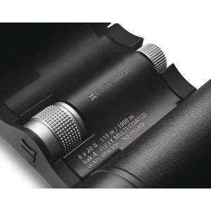Elegant zwart domineert de verfijnde verrekijkers. Verstevigingen van fijn, slijtvast kunstleer vormen een spannend contrast met het matzwarte van de behuizing. Optische accenten worden bovendien gezet door de glanzend zwarte applicatie op de brug, het metalen focuswiel en het subtiele logo van de merkfabrikant.