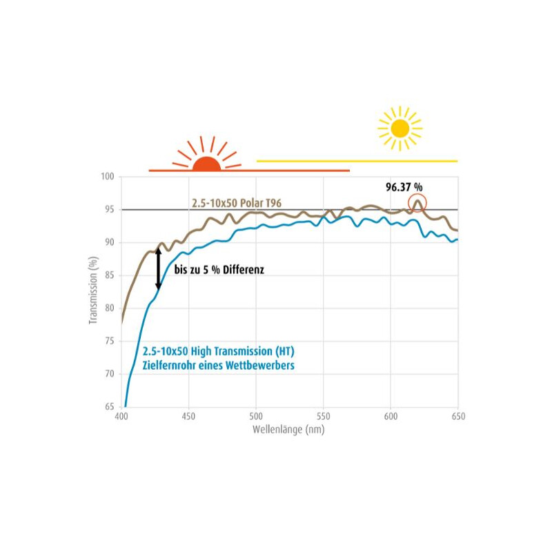 Met een transmissie van meer dan 96% is de 2,5-10x50 Polar T96 een ideale richtkijker voor 's avonds en 's nachts. De slanke objectiefdiameter van 50 mm geeft de richtkijker een compact ontwerp en heeft een grote uittredepupil, wat snel schieten aanzienlijk vergemakkelijkt. Daarom is de 2,5-10x50 Polar T96 ook uitermate geschikt voor de drijfjacht. Het dradenkruis is naar keuze verkrijgbaar in het eerste beeldvlak of met een fijn, voor daglicht en schemering geschikt rood punt in het tweede beeldvlak. De optioneel vergrendelbare ASV II (snelle dradenkruisverstelling) maakt de Polar tot een uiterst krachtige richtkijker.