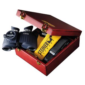 De verrekijker wordt geleverd in een houten kist inclusief drijfriem.