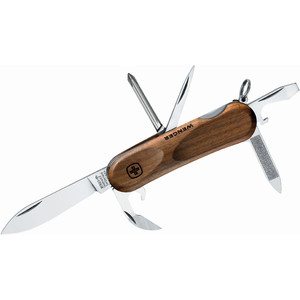Het Wenger zakmes EvoWood 11 heeft naast het lemmet een schroevendraaier met veiligheidsblokkering, een flesopener, een blikopener, een nagelvijl, een priem en een kruiskopschroevendraaier. De ergonomische vorm van de Evolution-handgrepen van fijn notenhout zorgt voor een prettige grip. Om het mes te beveiligen kan een veiligheidskoord of een messenketting worden bevestigd.