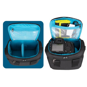 Deze schoudertas biedt ruimte voor een systeemcamera of compacte DSLR-camera met standaardobjectief en een flitser of een tweede objectief.