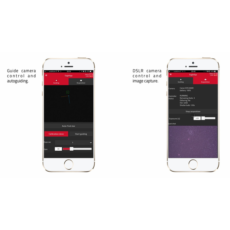 EAGLE CORE is ideaal voor beginners of astrofotografen die een afgestemd systeem met vooraf geïnstalleerde software wensen. De EAGLE OS-app neemt de camerabesturing en autoguiding over.