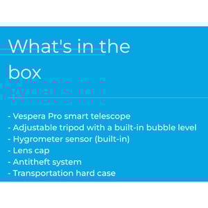 De Vespera Pro maakt astrofotografie eenvoudig dankzij automatische uitlijning, tracking en scherpstelling in combinatie met geavanceerde beeldverbetering (ook wel stacking genoemd). Binnen enkele minuten hebt u alles ingesteld en kunt u direct aan de slag. Met automatische live-mozaïekopname bent u niet langer beperkt door het fysieke gezichtsveld van de telescoop. U kunt een grotere verscheidenheid aan hemellichamen vastleggen en nieuwe mogelijkheden voor beeldcompositie ontdekken. Met zijn hoge resolutiesensor en live panorama-opname is Vespera Pro 's werelds meest veelzijdige slimme telescoop.