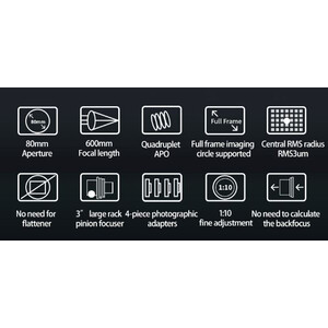 Met de geïntegreerde flattener biedt de FF80 grote voordelen voor astrofotografie: hij verlicht full-frame sensoren en garandeert een fijne afbeelding met puntvormige sterren op de as. De apochromat wordt geleverd met een uitschuifbare dauwkap, een 3" focuser met 360° rotatie, Vixen/GP-zoekerbevestiging en vier verschillende camera adapters (M76, M68, M54 en M48). De tubus zelf weegt 3,9 kg, met buisringen en rail is het gewicht dan 4,7 kg.