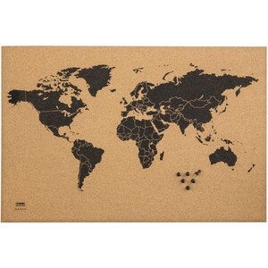 Op dit fraaie prikbord in wereldkaartontwerp kunnen wereldreizigers perfect hun herinneringen vastleggen of hun volgende reizen plannen. Het decoratieve prikbord kan ook worden gebruikt om alle losse papiertjes op kantoor of thuis te ordenen en daarbij te dromen van vakanties en verre reisbestemmingen. Om plaatsen te markeren of foto's en souvenirs op te hangen, worden bij het prikbord 6 zwarte prikpennen meegeleverd. Het presentatiemateriaal blijft stevig op het bord zitten en kan snel weer worden verwijderd, zodat de wereld steeds opnieuw kan worden ingericht.