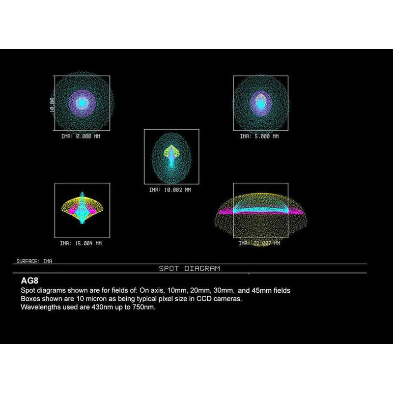 - Wynne corrector: The design of the AG corrector was finalised after months of calculations and field tests with different cameras and telescopes. It is not only used in the AG models, but also works incredibly well with telescopes from other manufacturers with different mirror sizes and aperture ratios. The corrector, which reduces the image to 0.95 times its size, consists of four elements made of special glass, arranged in two individual lenses and a cemented doublet. This focuses the light from the telescope onto a flat image plane with a diameter of 60 mm, without colour aberrations. The design is based on the use of several rare earth glasses and the computer-assisted selection of the curvature radii of the lenses. Thanks to the complex construction, even world-renowned astrophotographers can no longer find any errors in the images.
