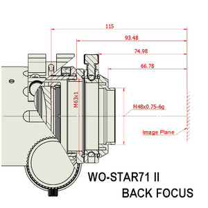 The 2.5" focuser with 1:10 reduction and 35 mm focus travel is equipped with an M48 thread. This offers numerous connection options for cameras. For example, a single-lens reflex camera (DSLR) can be connected directly using a bayonet adaptor with M48 thread. Since the correction optics are already integrated into the optical system of the Star 71, there are no problems with optical path lengths, as is otherwise the case when using an external flattener.