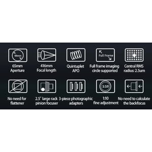 The FF65 is a Flatfield Astrograph with an aperture ratio of f/6.4 and a focal length of 416 mm.