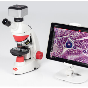 A digital learning microscope for beginners. The Wi-Fi camera with 4 MP resolution enables fast image transfer to tablets and smartphones. A carrying handle for transport, a small footprint for easy storage and recessed screws to protect against accidental adjustment of the eyepieces and tube make the RED50X Plus the ideal companion in schools.